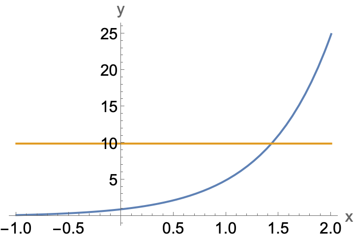 First observe that this equation must have a unique solution. This is because the exponential function \(f(x)=5^x\) is one-to-one. In the figure below it appears that the graph of \(y =10\) crosses \(y=5^x\) exactly once somewhere near \(x\approx 1.5\text{.}\)
