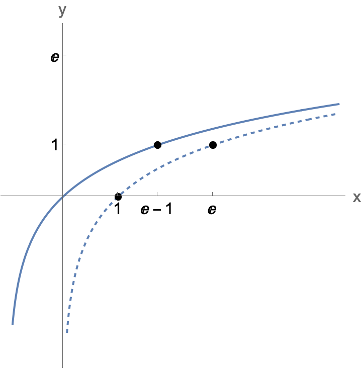 Figure8.4.6.The graph of \(y = \ln(x+1)\) (solid) compared to \(y = \ln(x)\) (dashed).